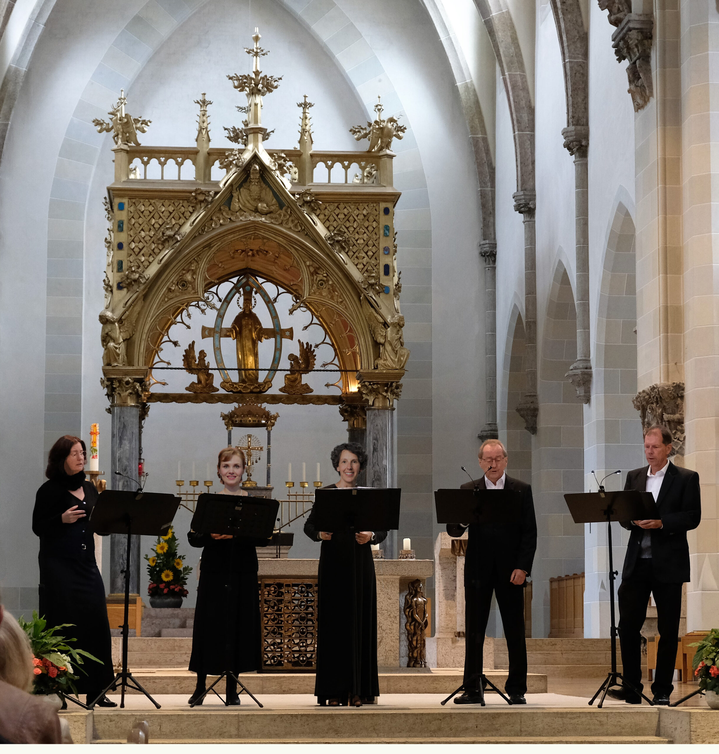 390 In der musikalischen Gestaltung der Gottesdienste in Beuern sind Elisabeth Schwarzenbrunner (Sopran) und Sophie Lübbeke (Alt) seit 2010 ein bewährtes Duo, das Josef Graf (Bass) an der Orgel begleitet oder zum dreistimmigen Gesang ergänzt. Als 2017 Pater Regino Schüling OSB aus St. Ottilien (Tenor) dazustieß, konnte das Ensemble auch Motetten aus der vierstimmigen Chorliteratur verschiedener Jahrhunderte darstellen. Gelegentlich stehen mit weiteren Sängern und doppelt besetzten Stimmen auch fünfstimmige Motetten auf dem Plan, so dass sich das Quartett zu einem in der Besetzung variablen Vokalensemble entwickelt.