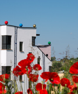 Modern und traditionell. Seit 2009 stellt die Andechser Molkerei ausschließlich Bio-Produkte her – Marke „Andechser Natur“. Für die Produktion wird ausschließlich Bio-Milch von Kühen und Ziegen von 530 Bio-Kuhmilchbauern und 100 Bio-Ziegenmilchbauern bezogen. Dazu passend das Verwaltungsgebäude und Hochregallager im Sinne der Philosophie des Künstlers Friedensreich Hundertwasser.
